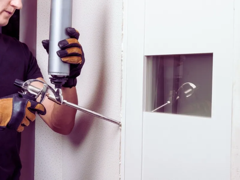 - Герметизация отверстий и пустот. Благодаря уплотняющему эффекту монтажная пена для заделки трещин, щелей и швов используется при установке окон, дверных коробок, гипсокартона, заливке бетона, укладке кирпича или кровельных материалов. Состав плотно заполняет отверстия, не дает пройти воздуху и воде.