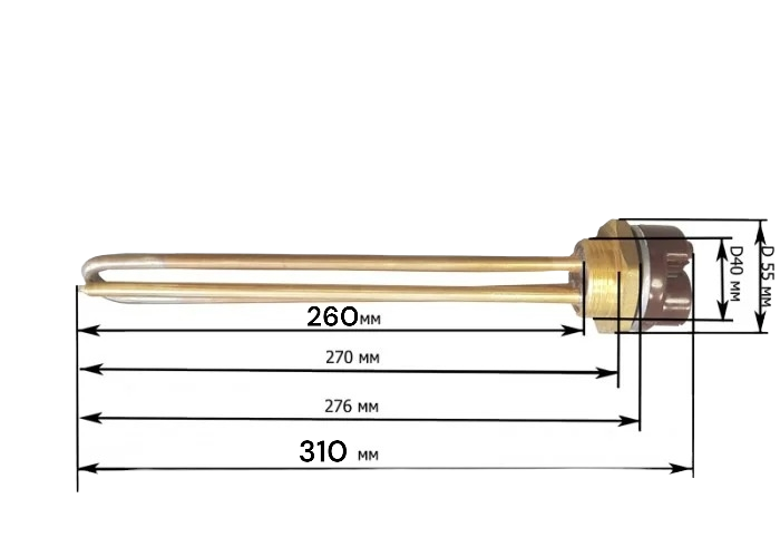 Нагревательный элемент длиной 27 см, выполненный из медного сплава, позволяет быстро подогреть воду до необходимой температуры.