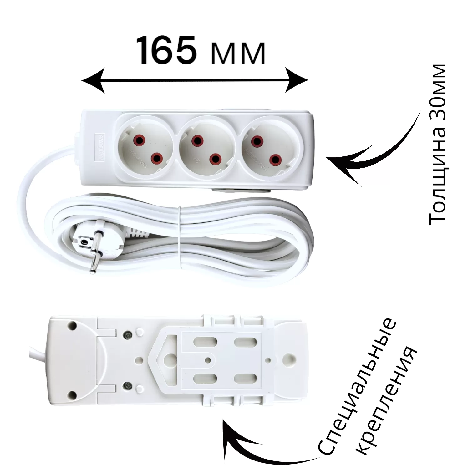 Сетевой тройник 5 м имеет номинальное напряжение 220 В, номинальный ток 16 А, степень защиты от пыли и воды IP 20. Длина корпуса 165 мм. На тыльной стороне предусмотрено крепление для повеса на стену.