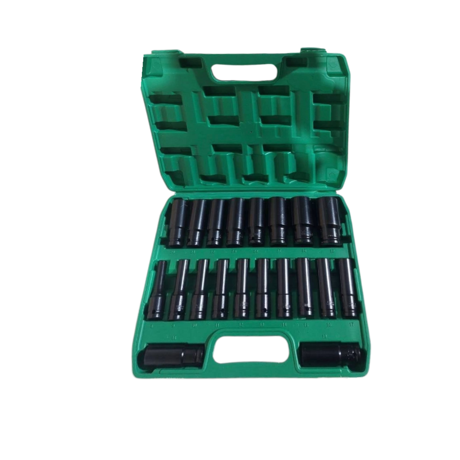 Набор торцевых ударных глубоких головок 20 предметов предназначен для гайковертов. Благодаря своей удлиненной конструкции, головки длиной 80 мм легко достигают труднодоступных мест, что значительно облегчает проведение работ. Ударные головки выполнены из закаленной стали для особой прочности и твердости, а также защищены специальным антикоррозийным покрытием. Такой качественный набор инструментов прослужит Вам долгое время. Крепкий и надежный профиль головок для гайковерта успешно справляется с крепежом. Равномерное распределение усилия крутящего момента по всей внешней площади гайки. Улучшенное сцепление головок с гранями и стенками крепежа. Удобный кейс из ABS пластика имеет специальную нишу под каждую головку.