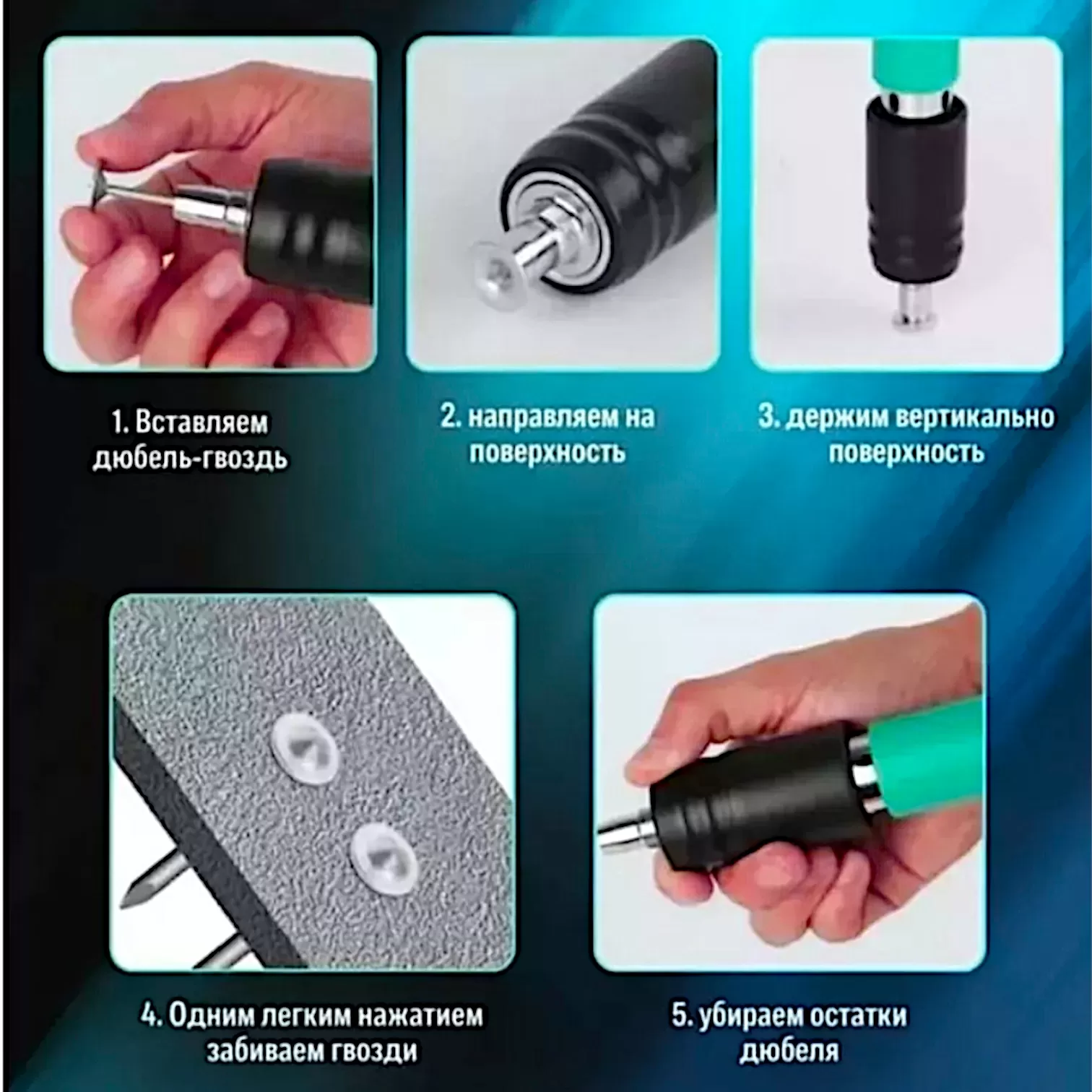 Мощный гвоздезабивной мини-пневмопистолет для дюбель гвоздей изготовлен из высококачественного пластика и металла, и имеет 5 ступеней регулировки мощности.