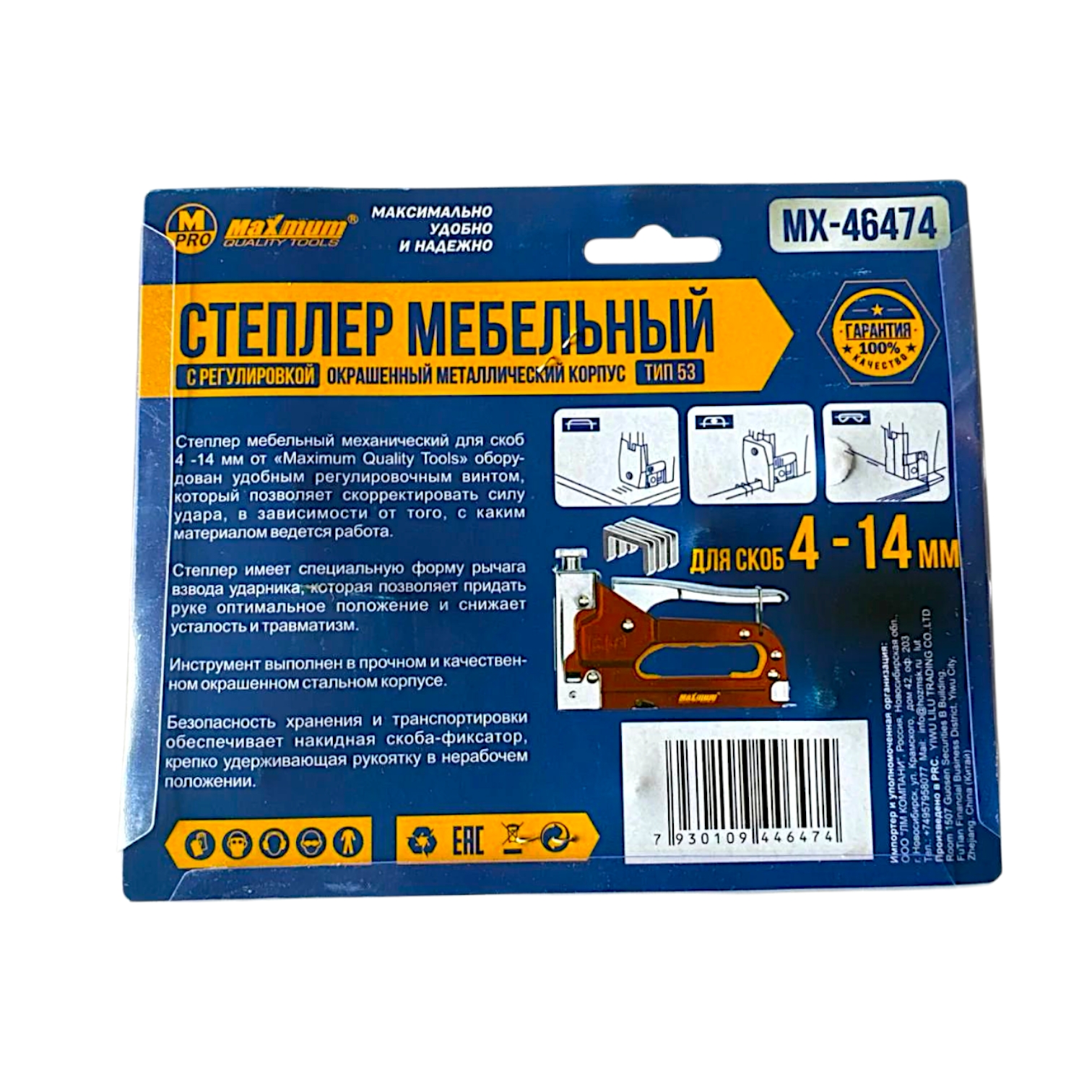 Механический мебельный степлер и набор скоб 8 мм 200 шт. от «MAXIMUM QUALITY TOOLS» (Максимально Качественный Инструмент) станут незаменимыми помощниками при фиксации проводов, монтаже пароизоляции и обшивке мебельных фасадов. Металлический степлер ручного типа (53 размера) поддерживает расходные материалы длиной от 4 до 14 мм. Инструмент оборудиван верхним регулятором мощности выстрела и удобным стопором, блокирующим рукоять в сложенном положении. Продуманная эргономичная рукоятка с прорезиненными вставками снижает утомляемость кисти, а регулятор натяжения пружины помогает выбрать щадящий режим для деликатных поверхностей.