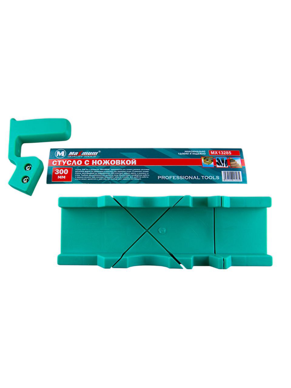 В комплект входит стусло, изготовленное из ударопрочного АБС-пластика черного цвета, и ножовка из стали.
