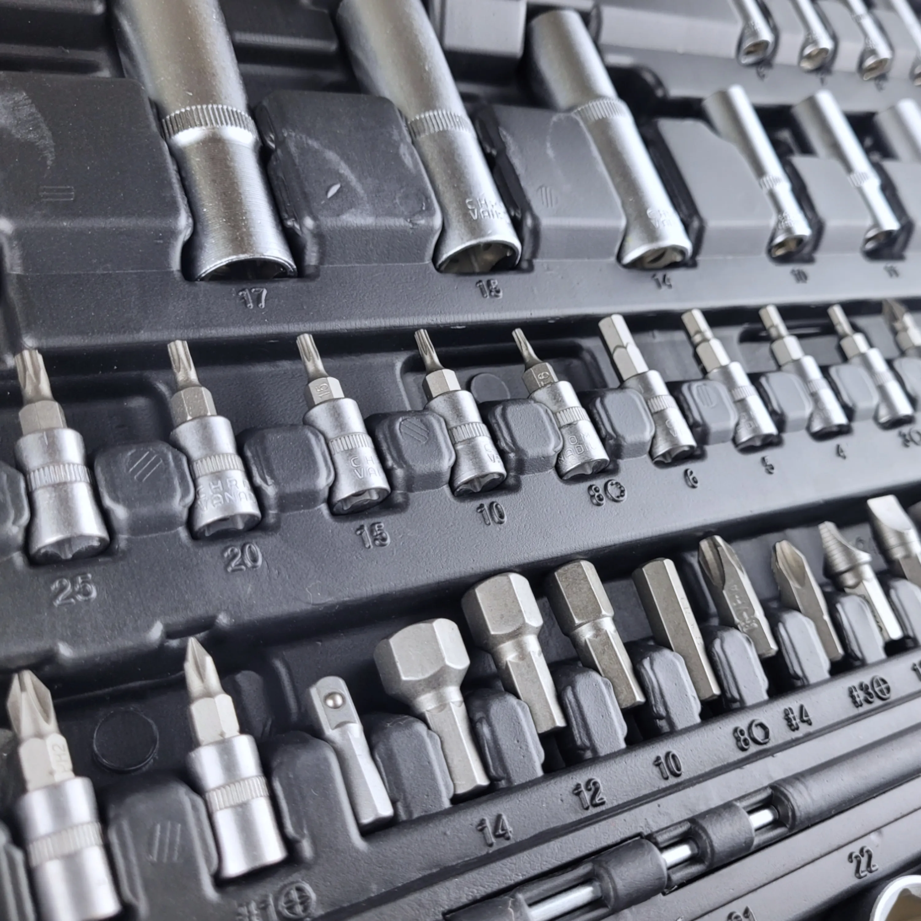 Набор инструментов в чемодане 94 предмета включает в себя комплекты удлиненных и торцевых головок 1/4", биты Torx, крестообразные Pz и Ph, SL, HX. Имеются дополнительные элементы, позволяющие выполнять операции в труднодоступных местах быстро и эффективно. Каждый инструмент промаркирован и занимает свое отдельное место. Все детали из представленного набора изготовлены из высокопрочной CRV стали и имеют высокий рабочий ресурс. Данный комплект станет прекрасным помощником для выполнения широко спектра ремонтных и монтажных работ с использованием крепежных элементов различных типов и размеров.