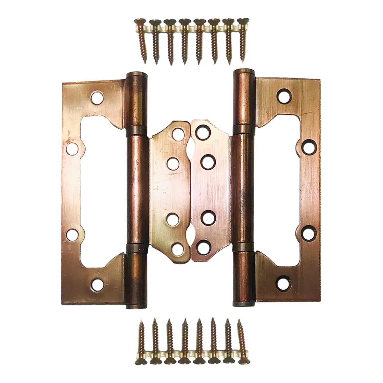 Петля усиленная дверная 2 мм толщиной предназначена для установки деревянных дверей. Монтаж без врезки с винтовым креплением осуществляется с помощью 16 саморезов. Гальваническое покрытие устойчиво к коррозии. В петле установлены втулка-подшипники и стальной стержень, что обеспечивает работоспособность 200 000 циклов открывания/закрывания. Максимальная нагрузка на 2 петли 30 кг. Саморезы в цвет античной бронзы поставляются в комплекте.