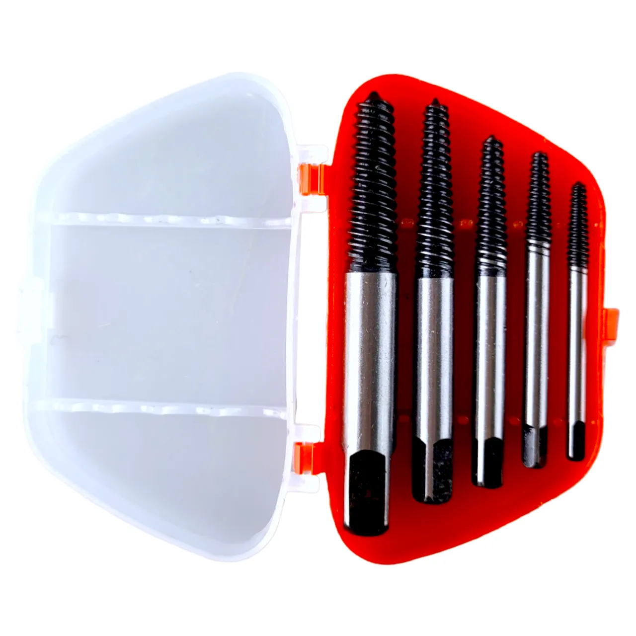 Экстрактор болтов или «вывертка» — слесарный инструмент которым без особого усилия можно удалить болты, винты и саморезы со сломанными головками или разбитыми шлицами. Принцип работы простой: экстрактор закручивается путем вращения по часовой стрелке, погружаясь в материал, извлекает поврежденный крепежный элемент. Экстракторы подбираются по размеру, в соответствии с величиной поврежденного крепежа. Набор из 5 экстракторов изготовлен из хром-молибденовой стали и поставляется в удобном кейсе для хранения. Экстракторы имеют прецизионный конический наконечник и подходят для резьбы поврежденных винтов M3-M18. Длина экстракторов в мм: 51, 58, 65, 75, 80. Диаметр: 2.5, 3, 4, 5, 6.5.