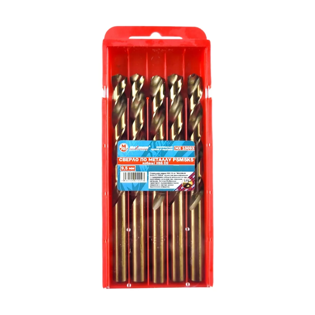 Сверло для шуруповерта и дрели по металлу 9,5 мм произведено из стали Р6М5К5 с добавлением кобальта и имеет общую длину 115 мм. Набор кобальтовых сверл 9.5 мм по металлу применяется для сверления нержавейки, титана, легированных сталей, чугуна, дерева. Правосторонняя канавка имеет угол наклона спирали 34° и угол заточки 135°. Содержание кобальта в составе улучшает его прочность и износостойкость, что позволяет производить более точные и эффективные отверстия.