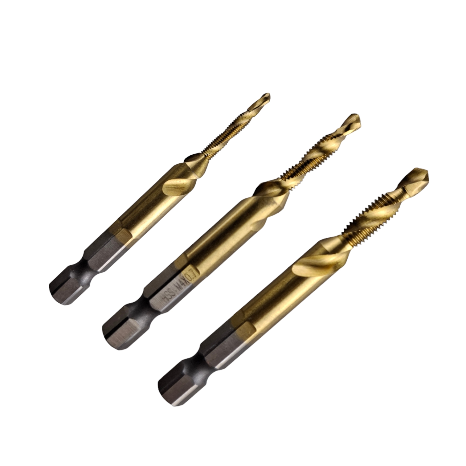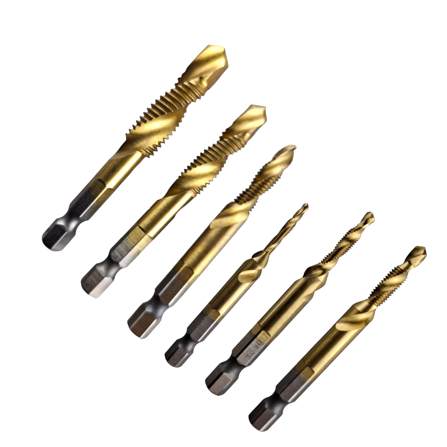 Набор комбинированных титановых сверл предназначен для нарезания резьбы, удаления заусенцев и зенковку по различным материалам: меди, дереву, латуни, алюминию, листовому металлу, пластику и т.п.